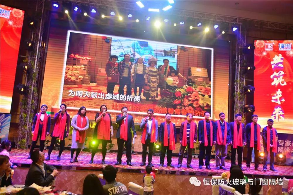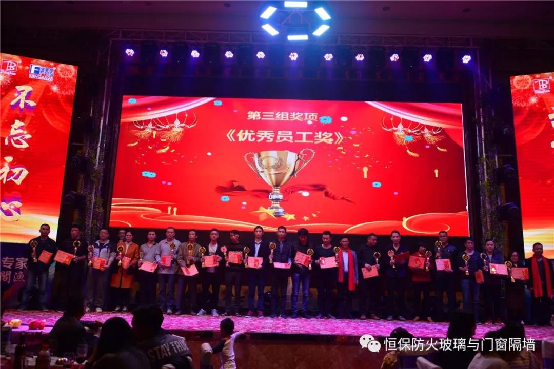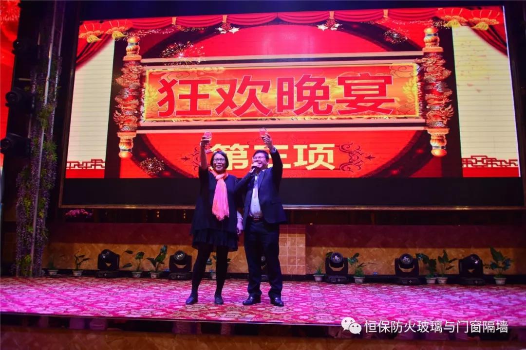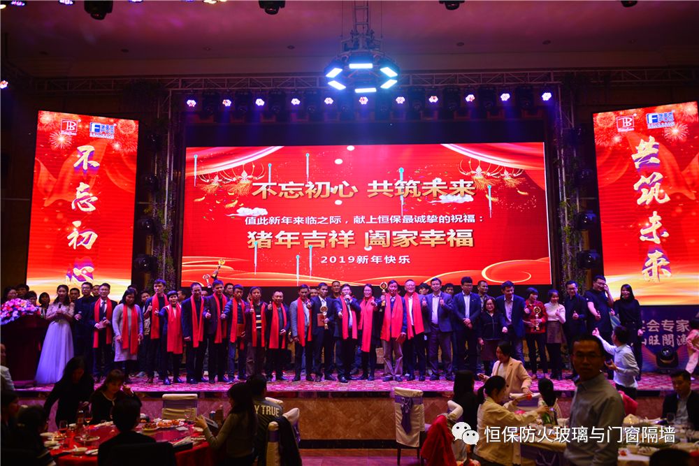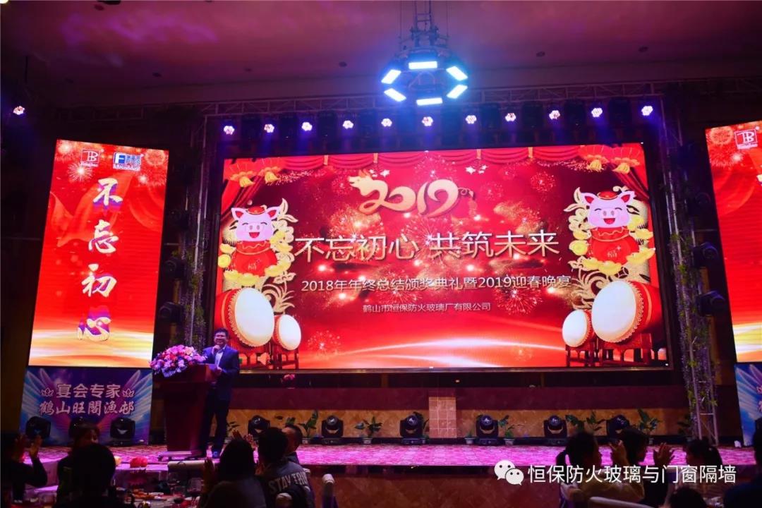 19:30分,恒保年會在鼓舞飛揚中拉開了帷幕,首先是恒保總經(jīng)理陳沃林先生做年終致辭,陳總回顧了2018年所取得的成績與不足,并提出了2019年恒保要全力以赴,不忘初心,繼續(xù)奮斗,再創(chuàng)佳績的戰(zhàn)略方針。2018年是恒??缭桨l(fā)展的一年。全體恒保家人,團結(jié)一心,艱苦奮斗,全力實現(xiàn)了公司既定的年度目標(biāo),同比各項重要指標(biāo)增長逾80%。2018年我們大力引進新設(shè)備,開發(fā)新產(chǎn)品10多項,產(chǎn)品通過國家檢測20多項 ,至此,恒保出品已擁有37個3C認證,158份檢驗報告,成為行業(yè)內(nèi)公認通過國家檢驗、認證最多的防火玻璃門窗企業(yè);2018年在行業(yè)各類權(quán)威獎項評比中,榮獲“全國鋁門窗幕墻展 年度星品獎”、榮獲“新玻網(wǎng) 門窗玻璃十強企業(yè)”、陳沃林總經(jīng)理榮獲鶴山市工商聯(lián)系統(tǒng)“工匠之星”稱號、陳沃林總經(jīng)理榮獲第五屆中國玻璃行業(yè)“玻璃工匠”稱號、榮獲第三屆建筑門窗金軒獎“最具創(chuàng)新力配套產(chǎn)品”、榮獲第三屆建筑門窗金軒獎“最具發(fā)展?jié)摿ζ髽I(yè)”、榮獲中國門窗幕墻行業(yè)“科技進步推動獎”等十多項獎項。2019年我們將持續(xù)優(yōu)化各部門管理,提高員工工作技能、提高生產(chǎn)管理水平、提高生產(chǎn)效率、提高綜合管理能力,減少物料損耗,減少出錯率。加強精密型材、新型防火門窗的開發(fā),滿足不同客戶的需求。2019年恒保上下一心、同心協(xié)力、不忘初心,共筑未來,為實現(xiàn)中國平安夢、世界平安夢繼續(xù)奮斗!