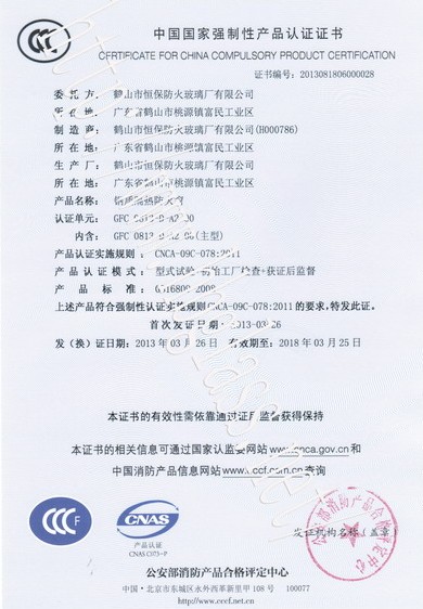 鶴山市恒保防火玻璃廠有限公司在陳總經(jīng)理的領(lǐng)導(dǎo)下,跟全體員工的共同努力下,于2013年3月18日通過(guò)國(guó)家防火建筑材料質(zhì)量監(jiān)督檢驗(yàn)中心的檢測(cè),最終通過(guò)由公安部消防產(chǎn)品合格評(píng)定