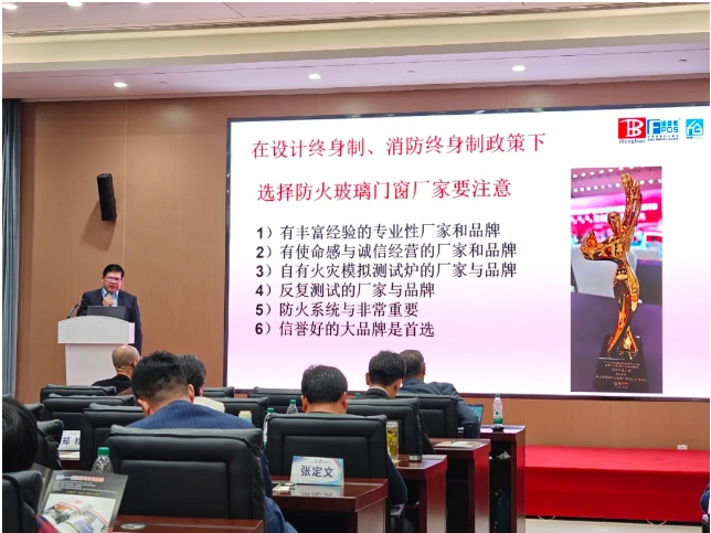 恒保董事長陳沃林先生在論壇上分享報告《高品質(zhì)防火玻璃及其在超高層建筑核心筒中的應(yīng)用》,從正確認識防火玻璃、什么是高品質(zhì)防火玻璃、高層建筑消防當(dāng)前趨勢以及高品質(zhì)防火玻璃系統(tǒng)在高層建筑中的應(yīng)用四個方面介紹防火玻璃系統(tǒng)產(chǎn)品在高層建筑消防的作用,并分享如何正確選擇防火玻璃系統(tǒng)產(chǎn)品的經(jīng)驗,讓高層建筑更加美觀實用的同時,避免出現(xiàn)火災(zāi)時“防火玻璃”不防火的現(xiàn)象。陳沃林先生呼吁大家共同抵制假冒偽劣防火玻璃產(chǎn)品,對建筑消防安全負責(zé)、對生命安全負責(zé)。